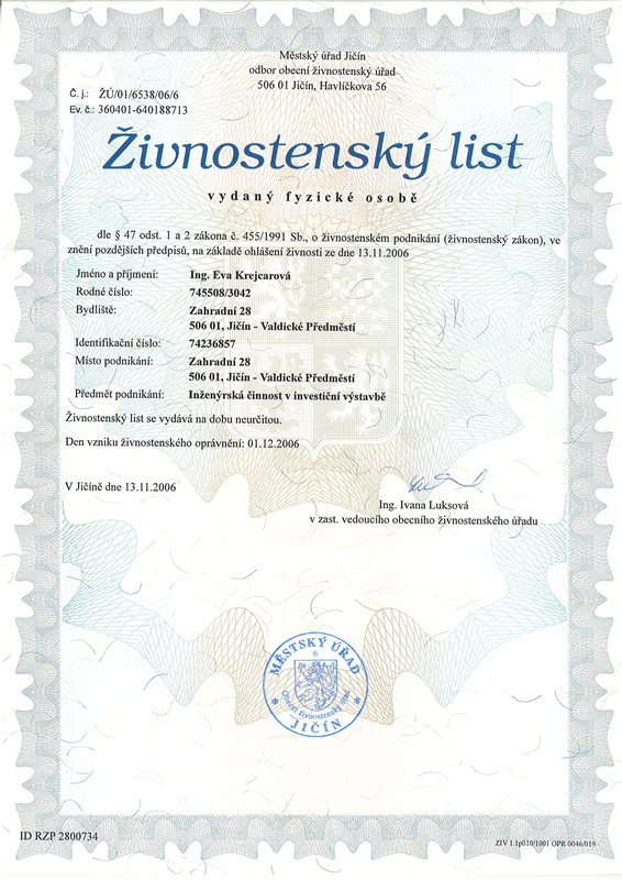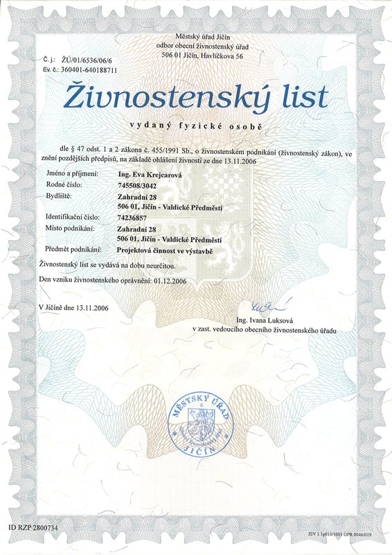 Živnost registrována u MÚ Jičín