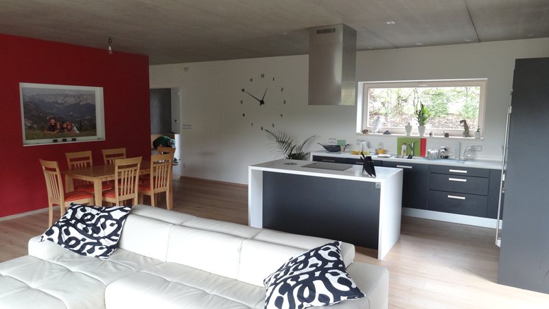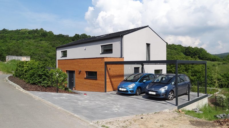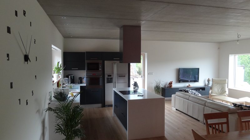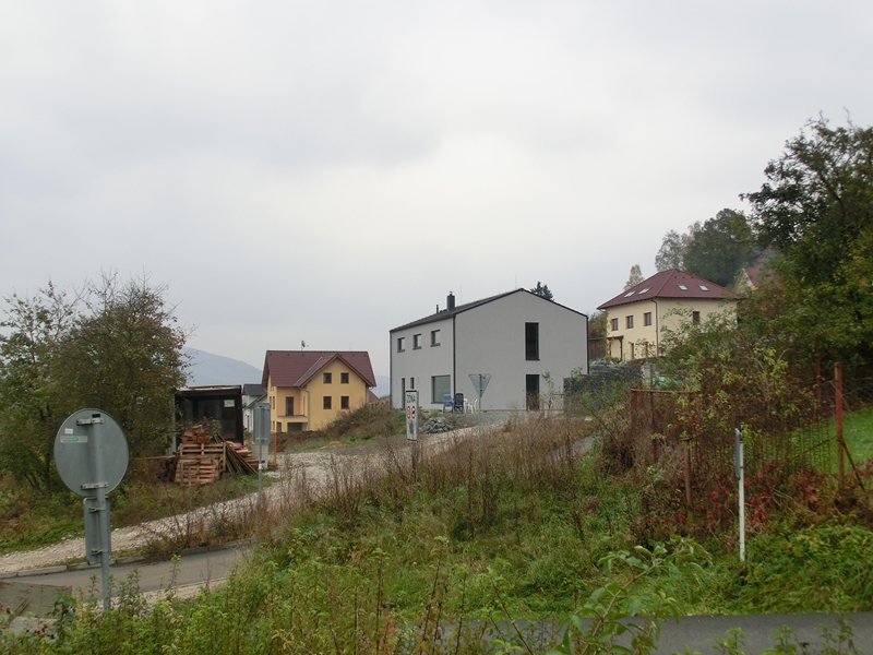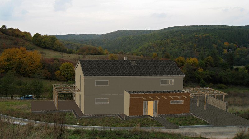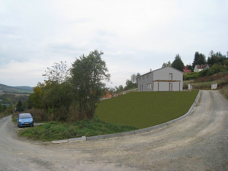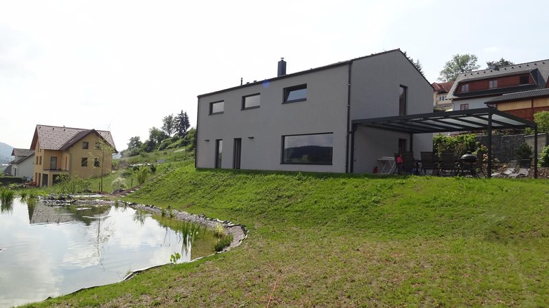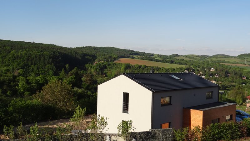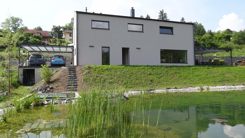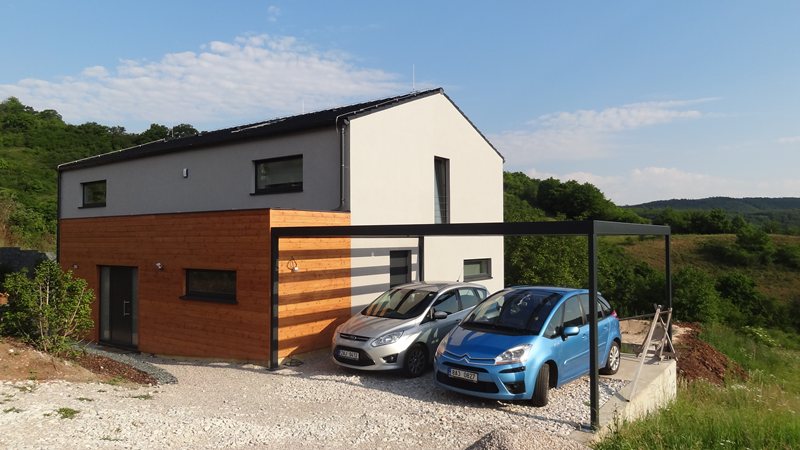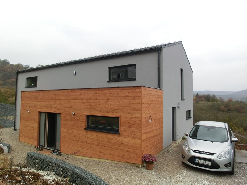 Dvoupodlažní moderní rodinný dům s výhledem na Berounku, zastavěná plocha 141m2, Projekt pro územní a stavební řízení, 2009, realizace stavby 2010-2011.